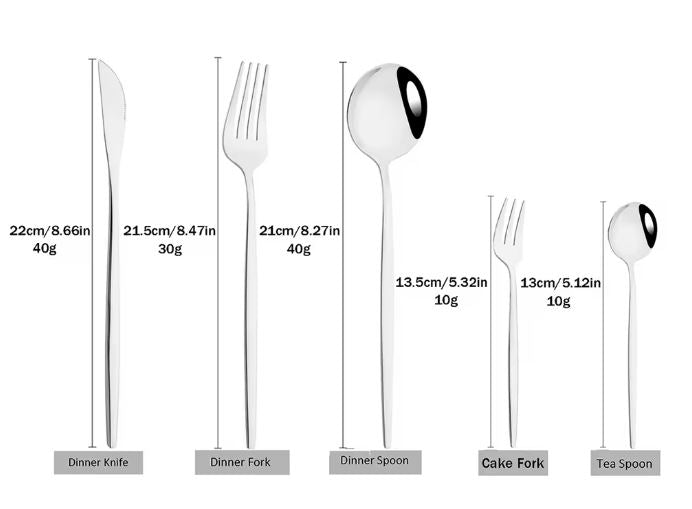- Fullt sett med kniver, gafler, skjeer og kakegaffler for komplett borddekking.