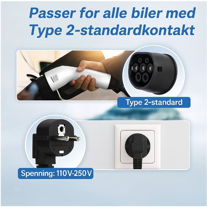 - Type-2-kontakt med støvdeksel – beskytter mot smuss, støv og fuktighet når den ikke er i bruk.