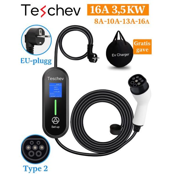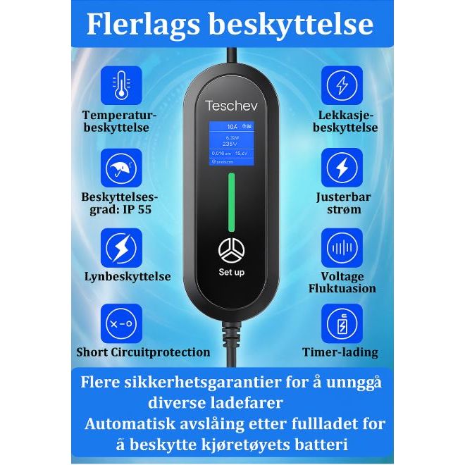 - Elbillader med innebygd jordfeilbryter og overspenningsvern.
