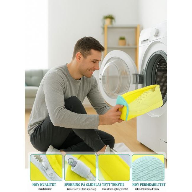 🟡 Glidelås som holder skoene sikre– Skoene faller ikke ut under vasken, og glidelåsen er beskyttet for å unngå at den hekter seg fast i trommelen.